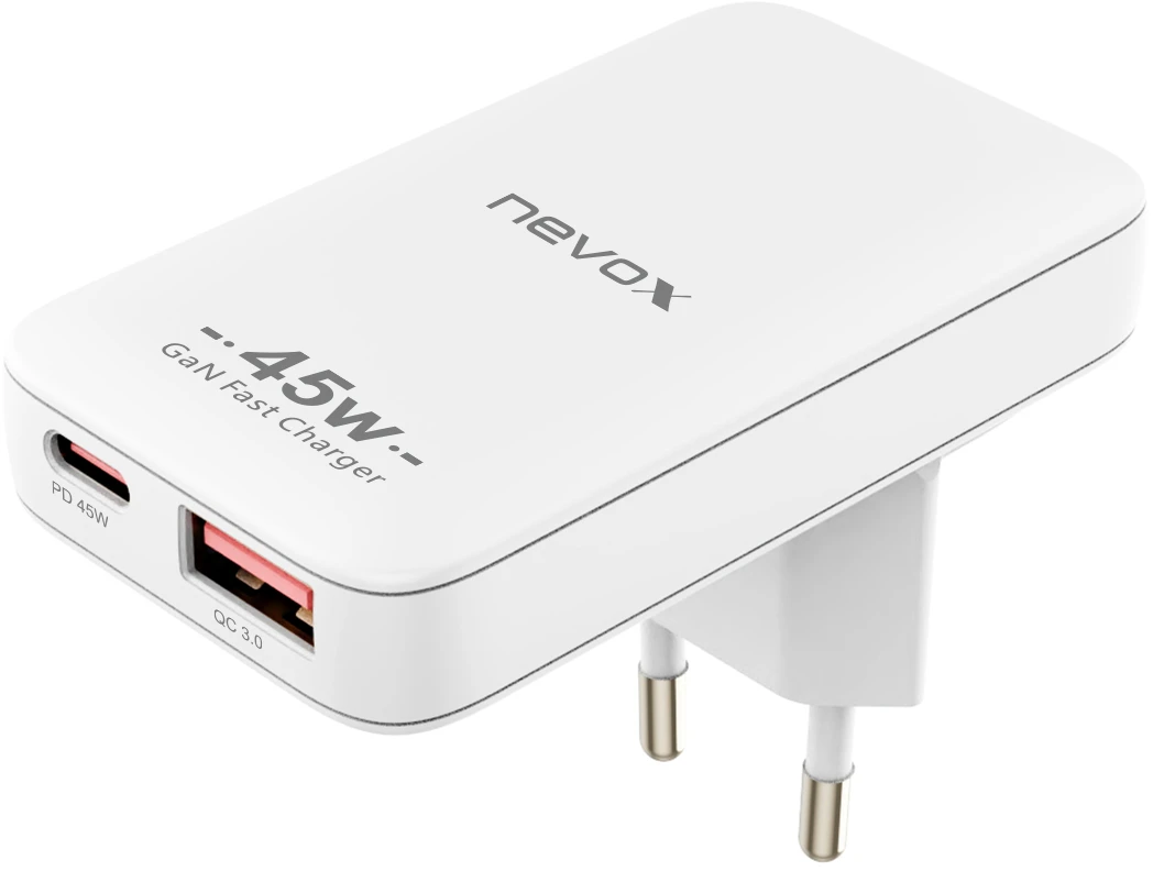 Nevox USB C PD / PPS + QC3.0 GaN Dual Ladegerät EU / US Stecker 45Watt Weiß